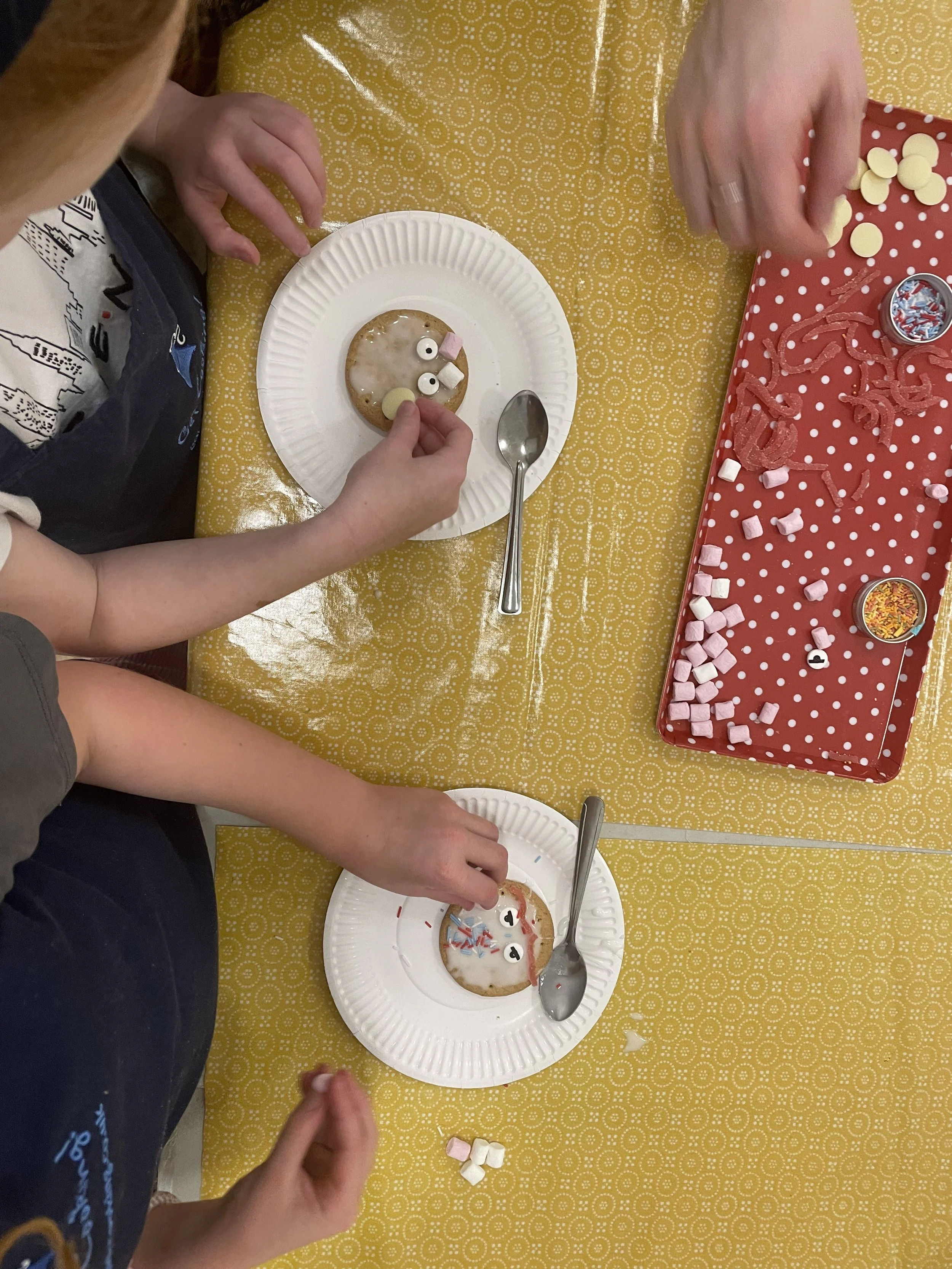 Under the watchful eyes of Anne Marie and parents, children took it in turns to fry off chopped veg with noodles and a little oil and so made a noodle stir fry. Any remaining chopped veg was added to a collective soup pot and cooked for about 15 mins to make a delicious soup to take home. While the soup was cooking, children were busy decorating spooky biscuits for pudding. Somewhere along the way they also learned to make a tasty one-egg omelette.