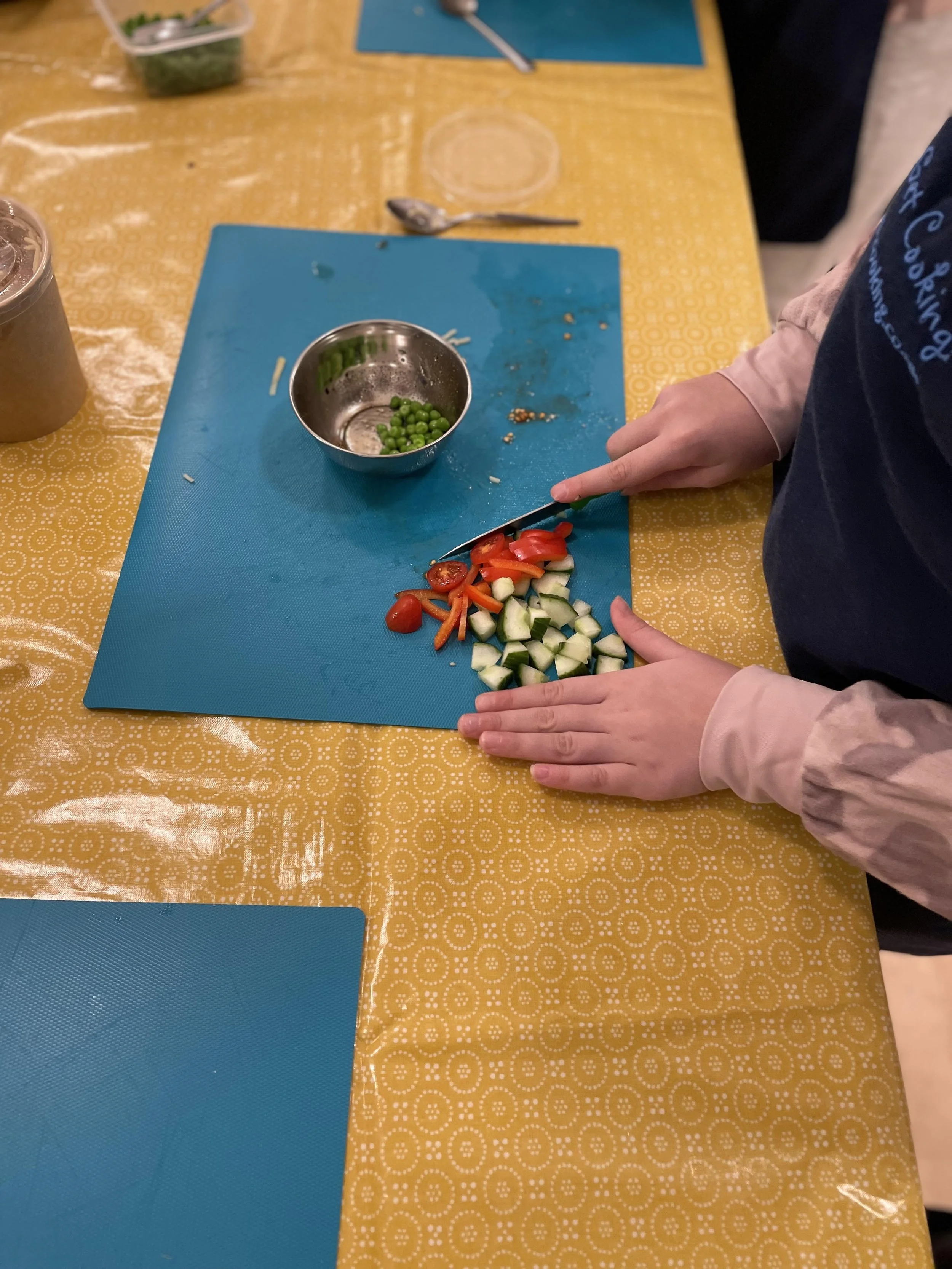 The activity was ably and calmly led by Anne Marie from Get Cooking Warwick and included knife skills, vegetable identification, how to chop vegetables to cook quickly (at an angle) and how to shred vegetables thinly to enhance their sweetness. Participants set to and created mounds of finely chopped veg which they added to cooked noodles and a tasty dressing, all mixed according to individual choice. This resulted in a tasty noodle pot salad which was quickly demolished by hungry participants.